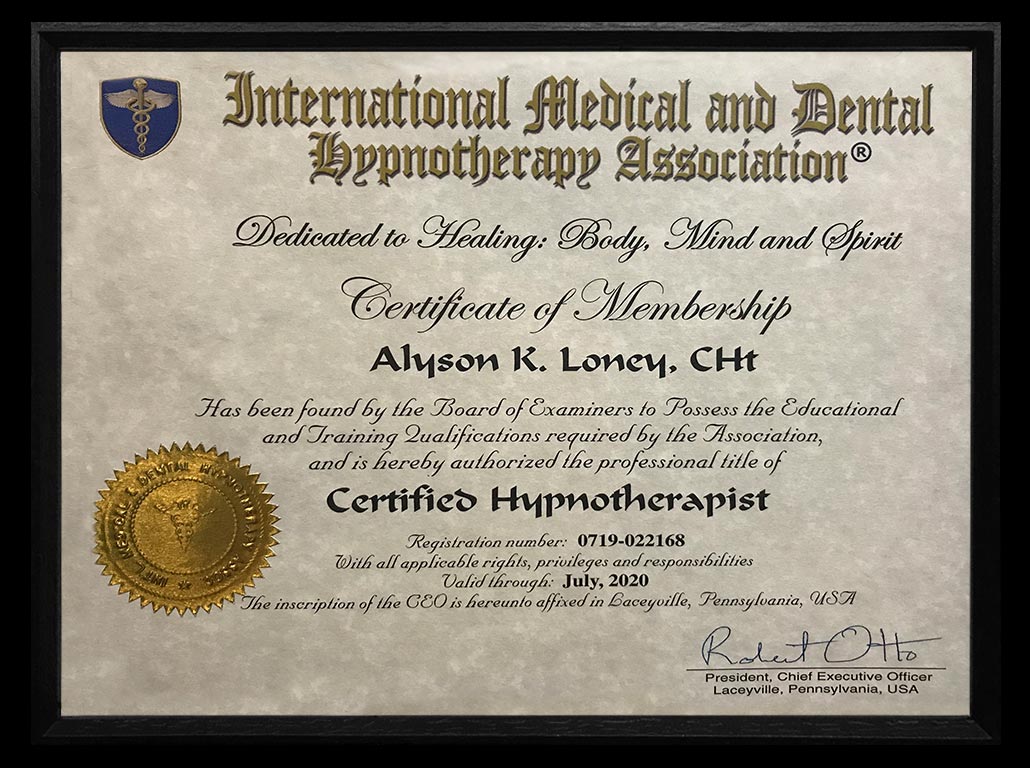 alyson is also a member of the international medical and dental hypnotherapy association; an association allowing excellently trained certified hypnotherapists to work with local healthcare profession...